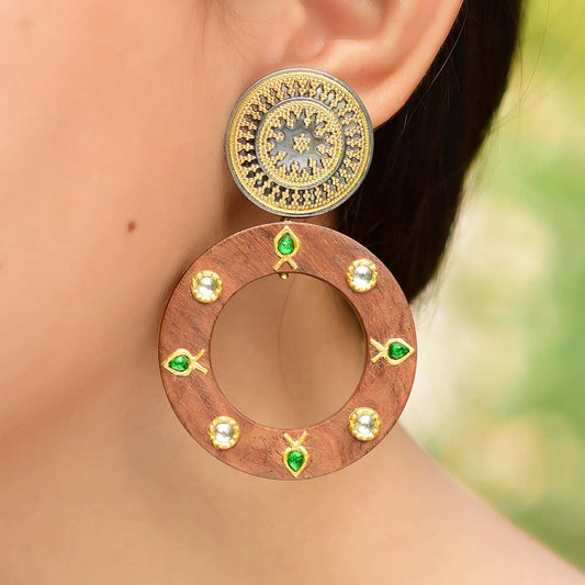 Hand Crafted Silver Gold Black Plated Jadau Wood Earring