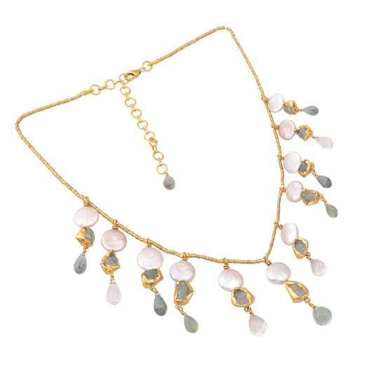 Handcrafted Silver Gold Plated Pearl/ Aquamarine Ruff Necklace