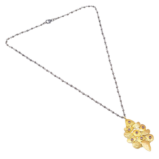Indian Handcrafted Silver Gold Plated Amethyst Pendant Black Plated Bead Necklace